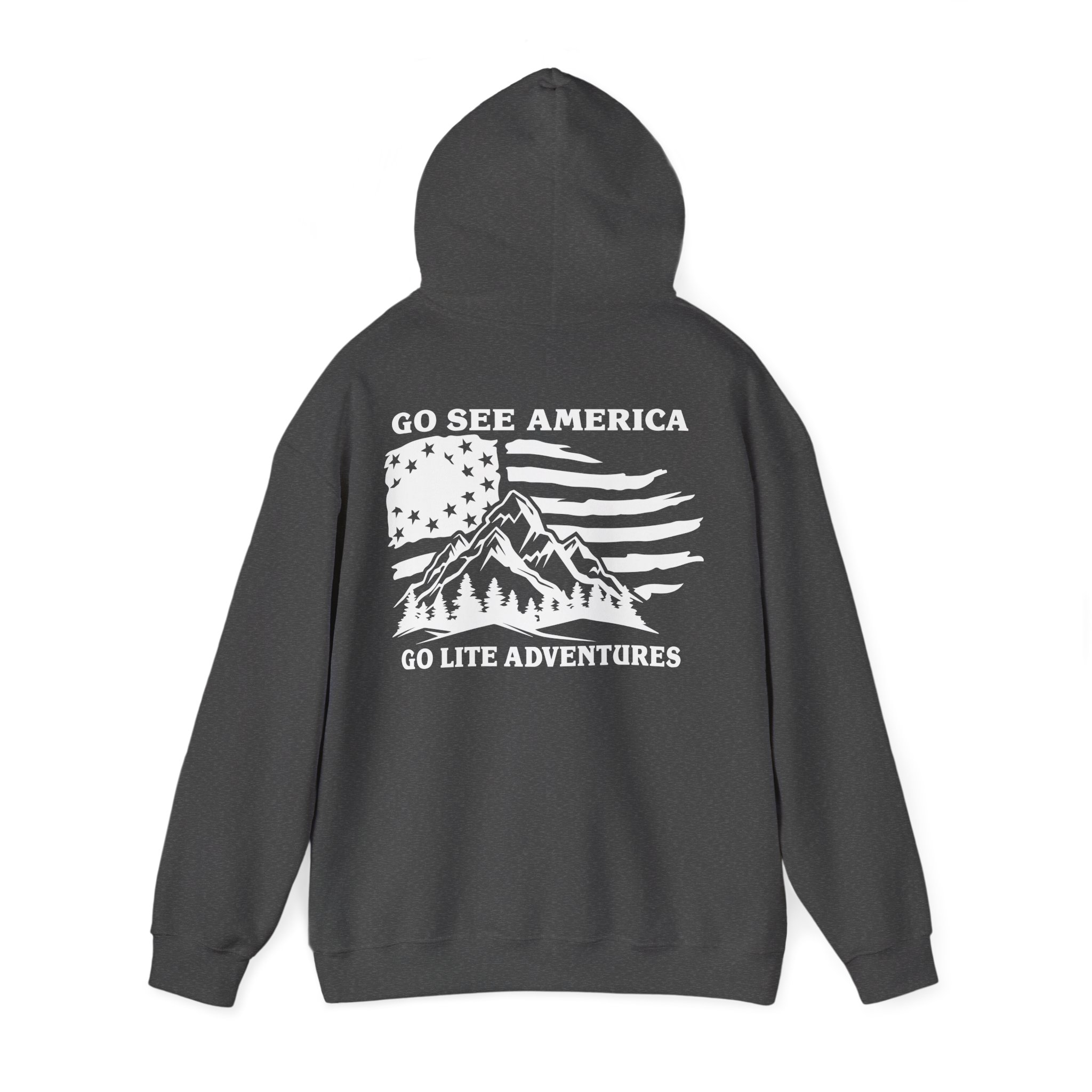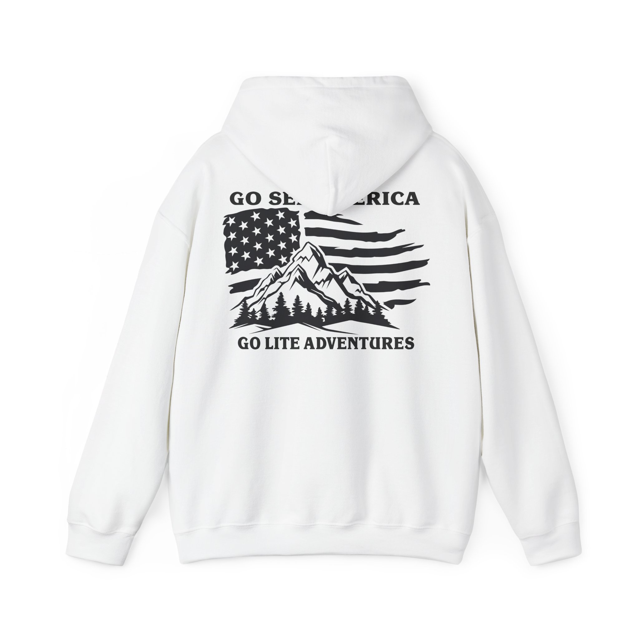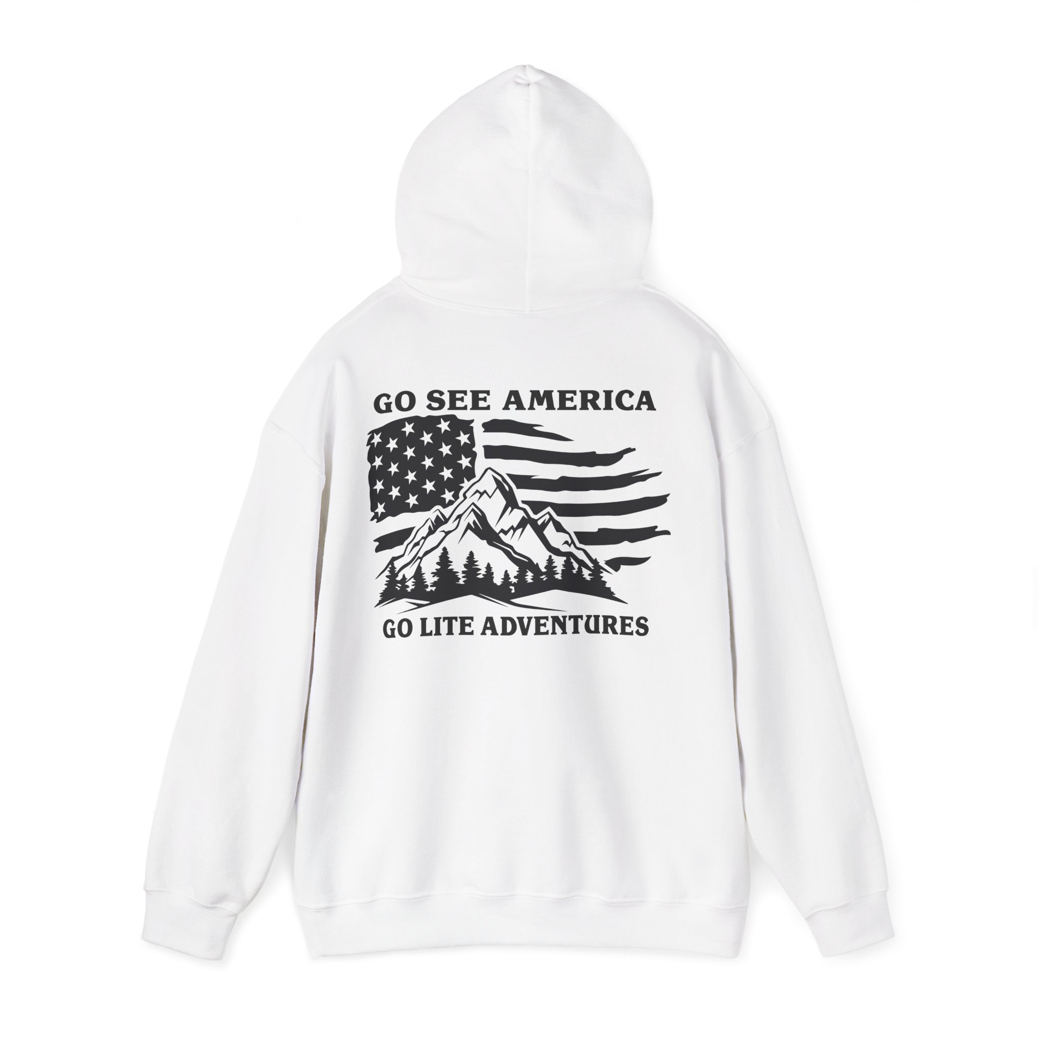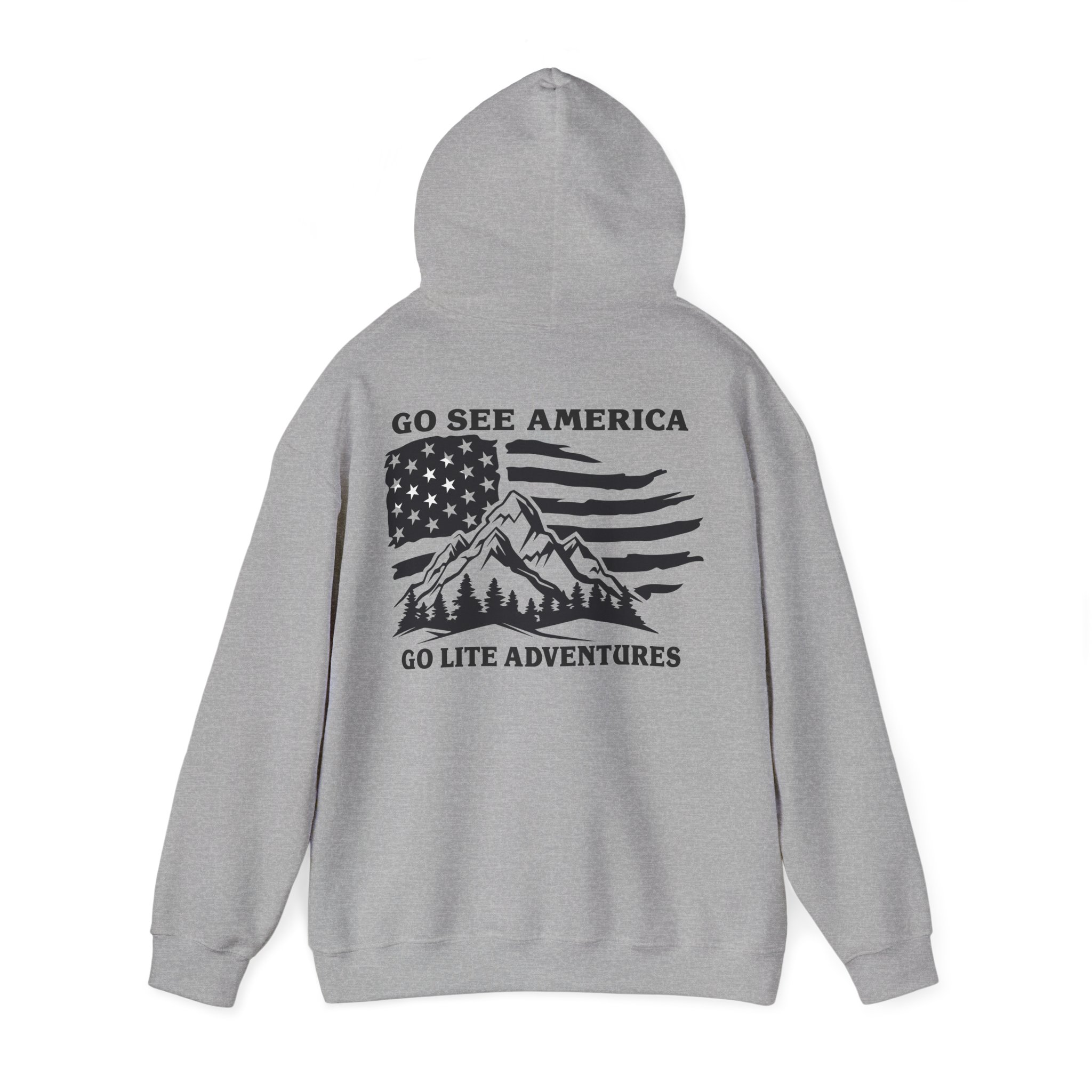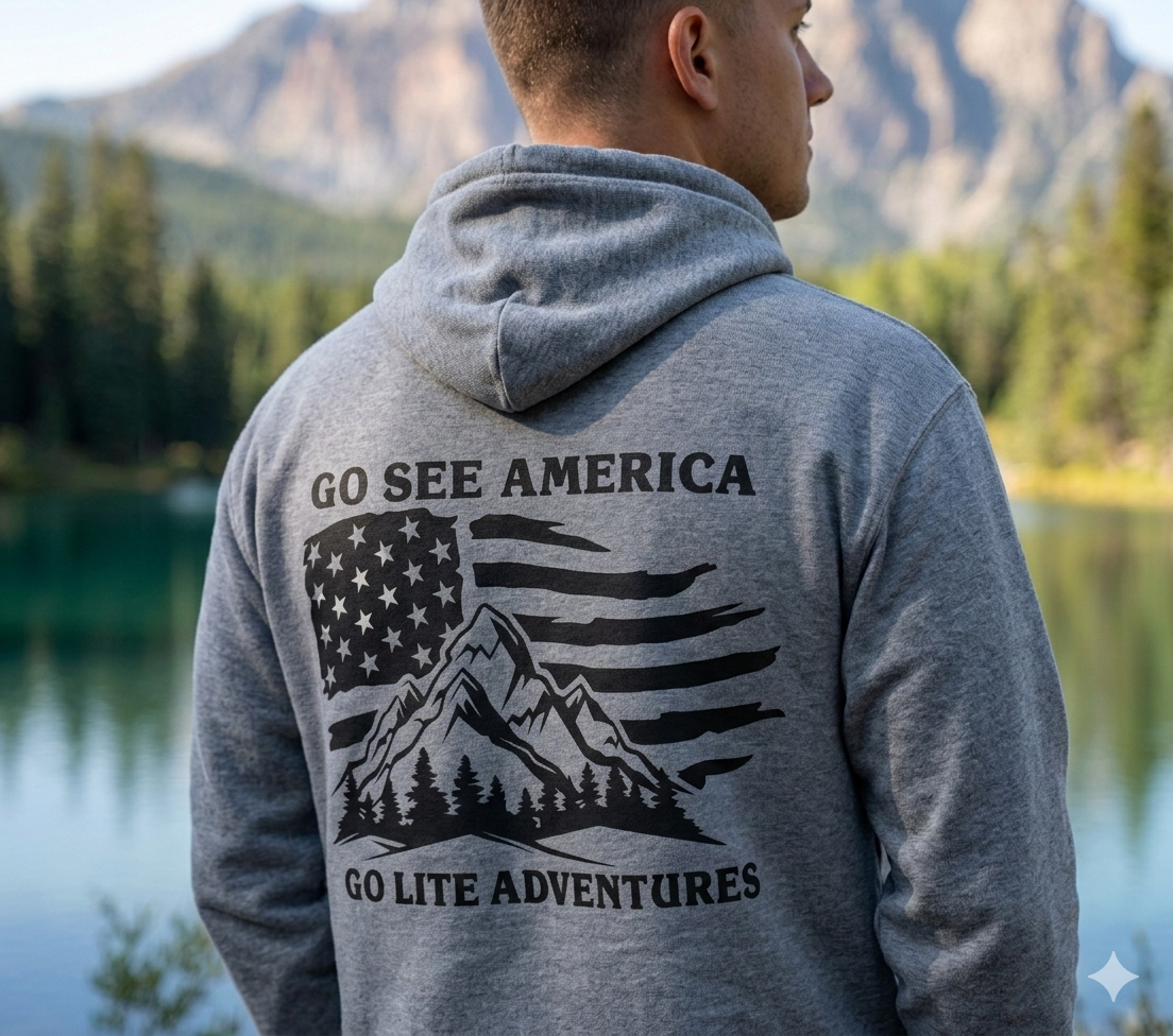A soft, midweight hooded sweatshirt designed for easy layering and everyday comfort. The Go Lite Adventures logo is printed on the left chest—subtle, worn-in, and quietly rugged. The back print shows a mountain over an American flag. The double-lined, color-matched hood and adjustable drawcord keep warmth where you want it. A roomy kangaroo pocket warms hands and holds essentials during hikes, late-night drives, or relaxed mornings at home. Tubular knit construction removes side seams for a smoother silhouette and reduced fabric waste. Breathable yet cozy, this hoodie settles into the rhythm of an active life: morning coffee, trailheads, and campfire stories.