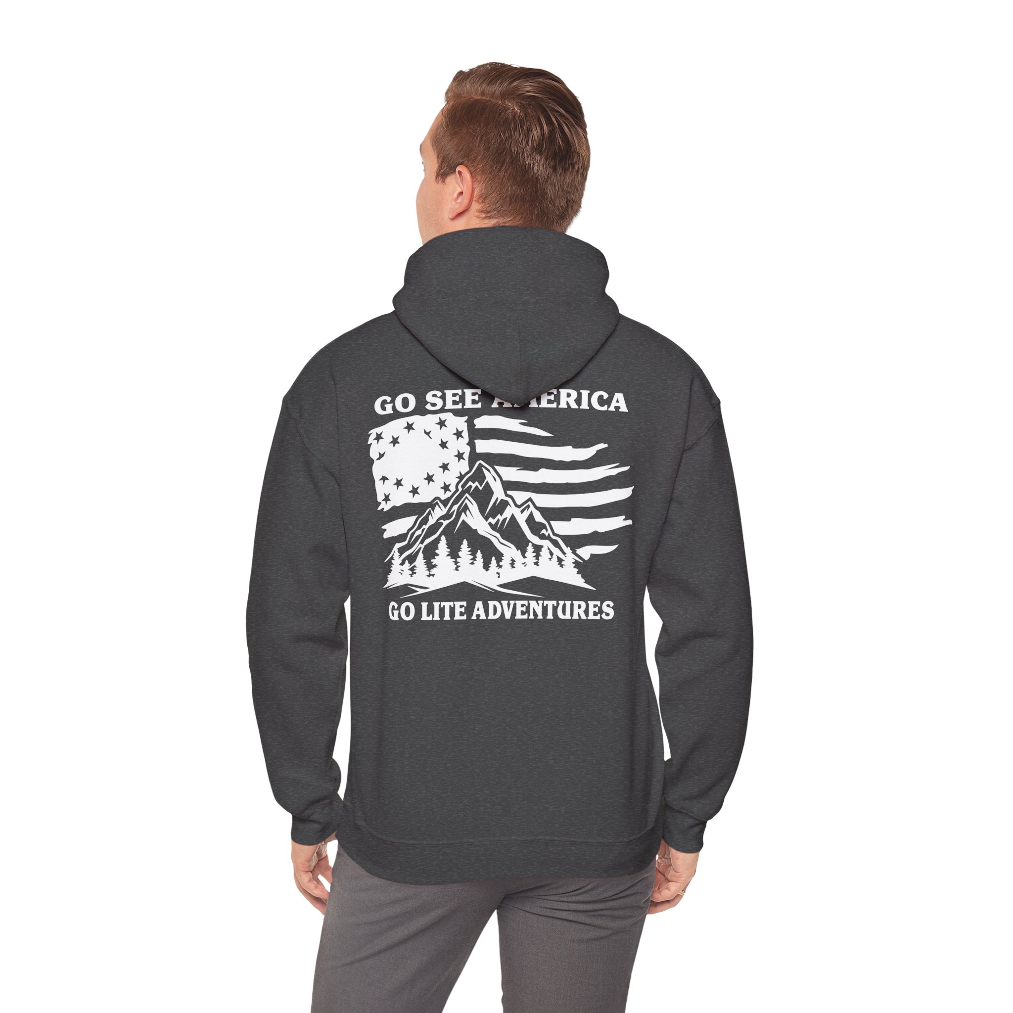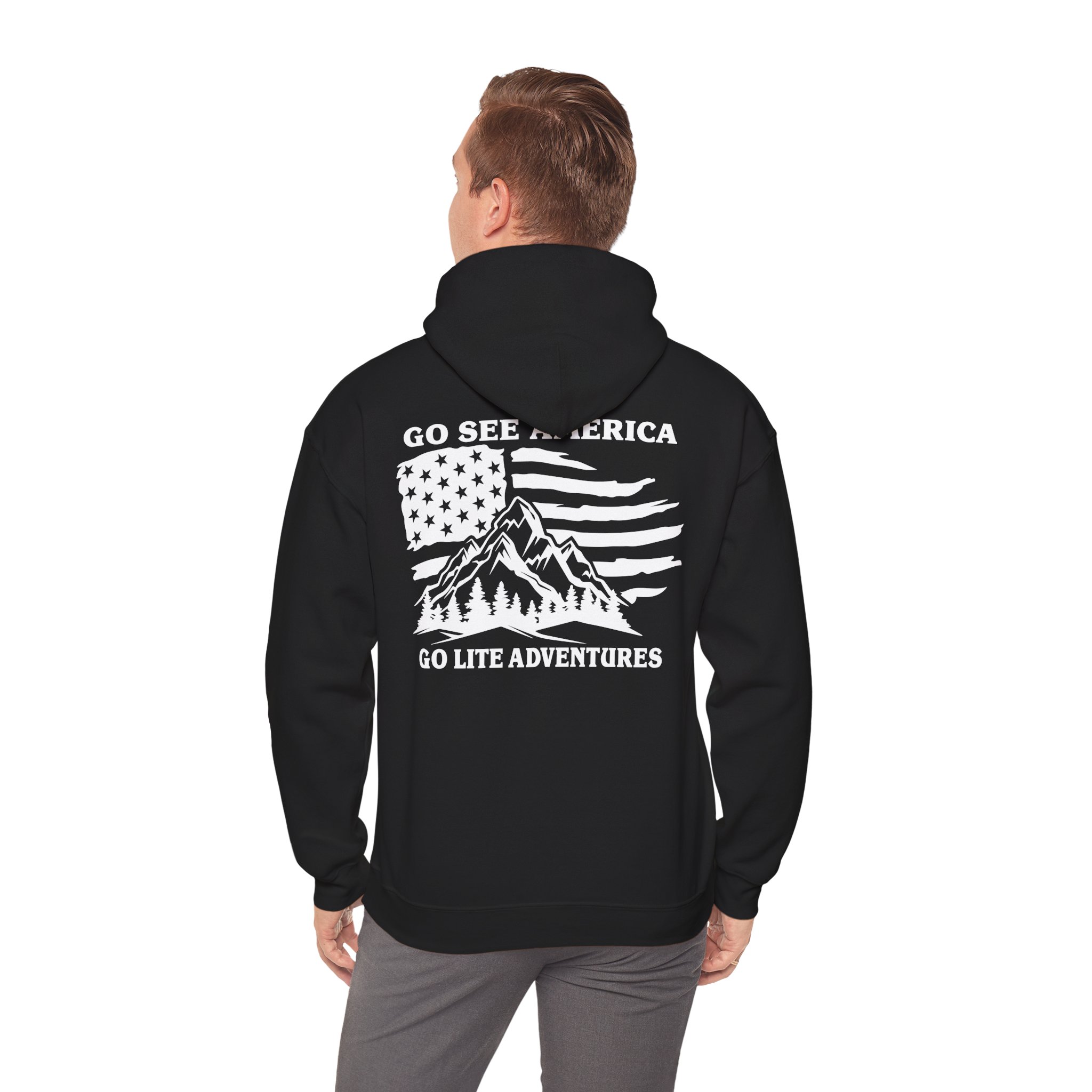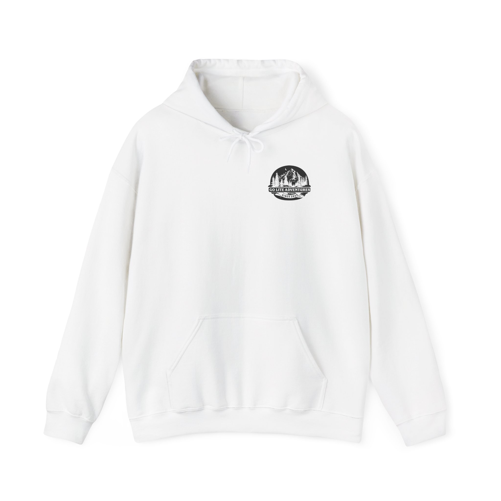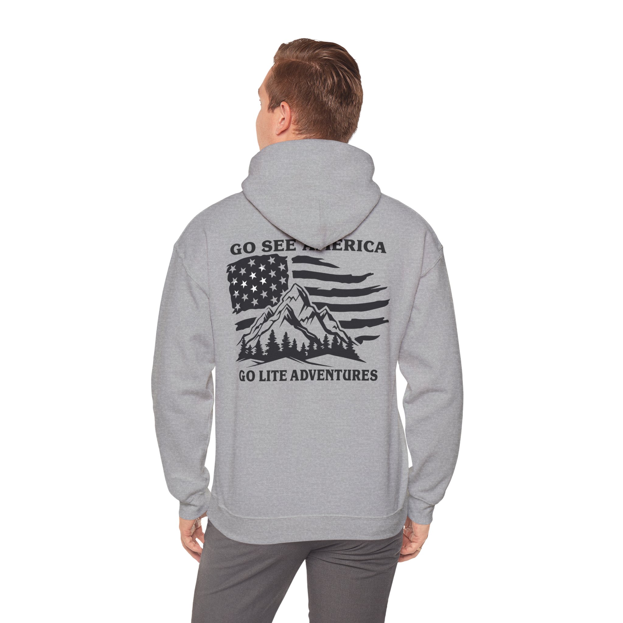 A soft, midweight hooded sweatshirt designed for easy layering and everyday comfort. The Go Lite Adventures logo is printed on the left chest—subtle, worn-in, and quietly rugged. The back print shows a mountain over an American flag. The double-lined, color-matched hood and adjustable drawcord keep warmth where you want it. A roomy kangaroo pocket warms hands and holds essentials during hikes, late-night drives, or relaxed mornings at home. Tubular knit construction removes side seams for a smoother silhouette and reduced fabric waste. Breathable yet cozy, this hoodie settles into the rhythm of an active life: morning coffee, trailheads, and campfire stories.
