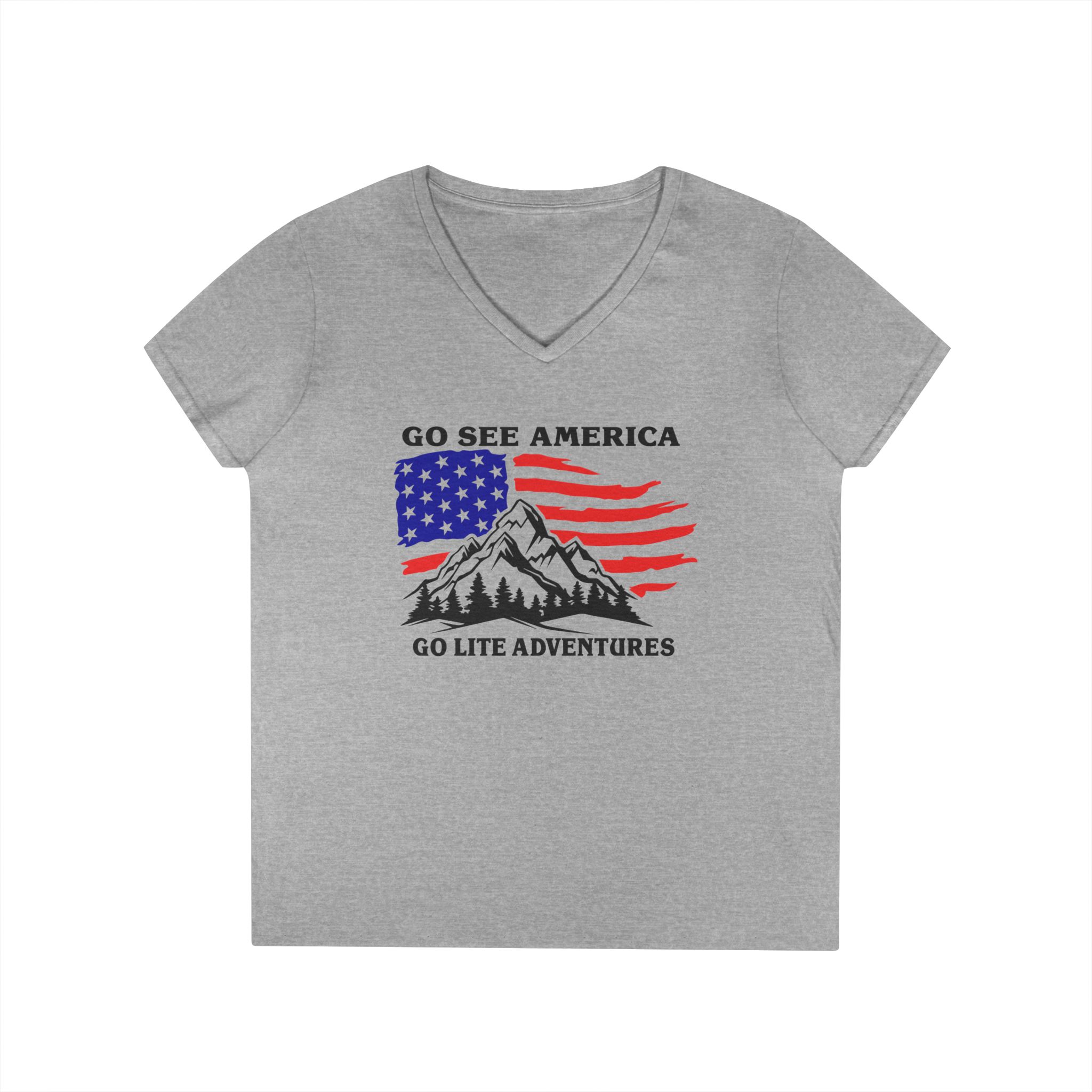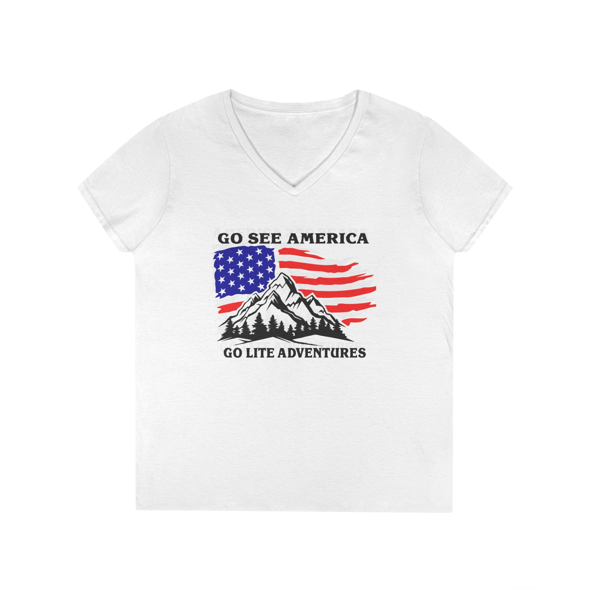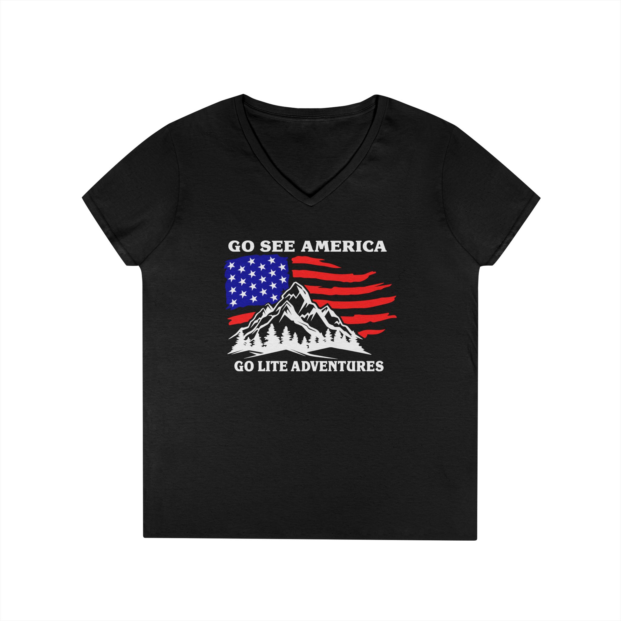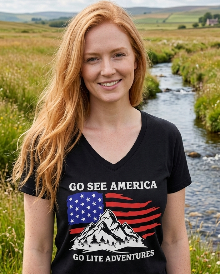 Lightweight and ready for the road — this V-neck channels the call of wide-open trails and roadside diners. A soft, semi-fitted cotton tee printed with a mountain and a red, white and blue American flag reads “GO SEE AMERICA / GO LITE ADVENTURES.” Short sentences, worn-in comfort, and a flattering V make it an easy layer for sunrise hikes, long drives, and casual evenings around a fire. It sits close enough to feel modern but moves with you when you reach for the map or snap a sunset photo. The tear-away label and reinforced seams keep distractions to a minimum so the view — and the journey — stay front and center.