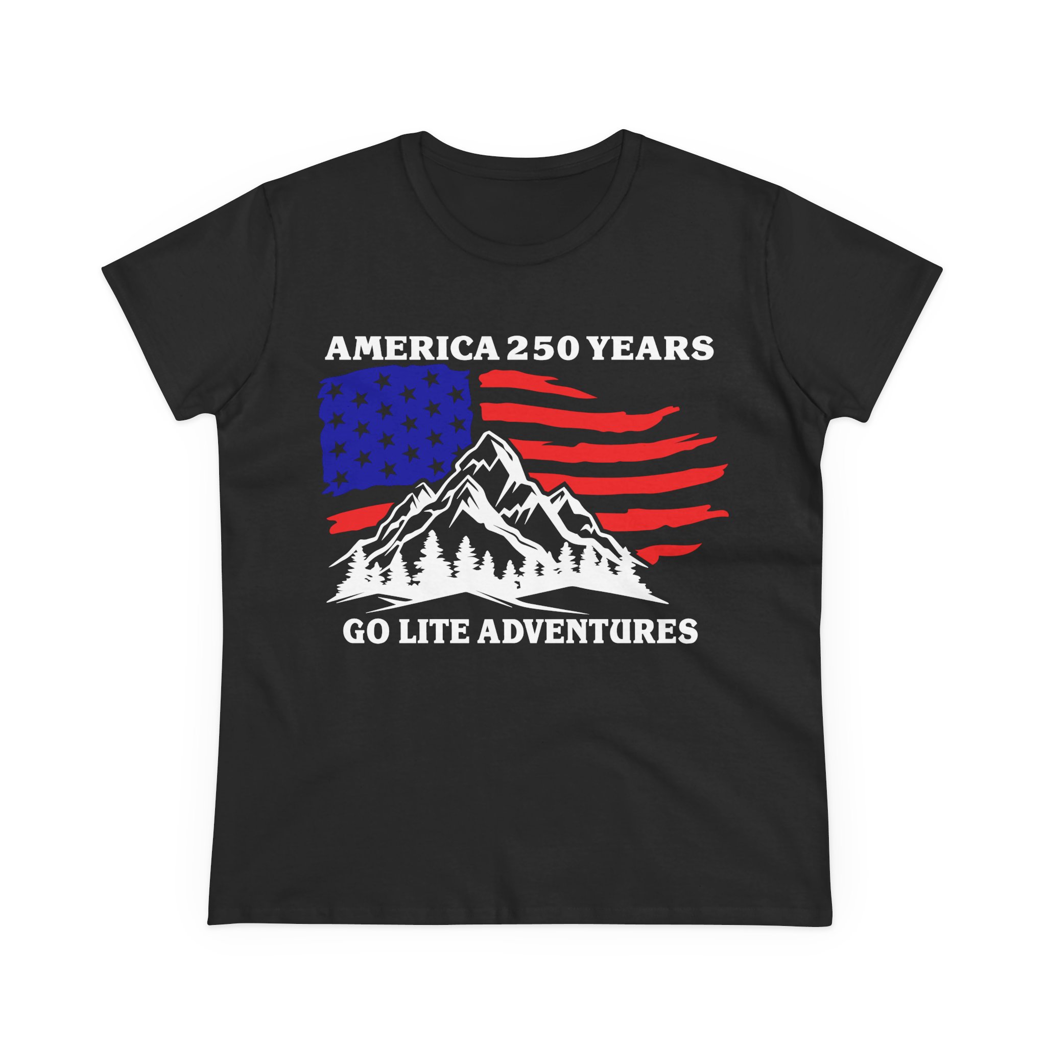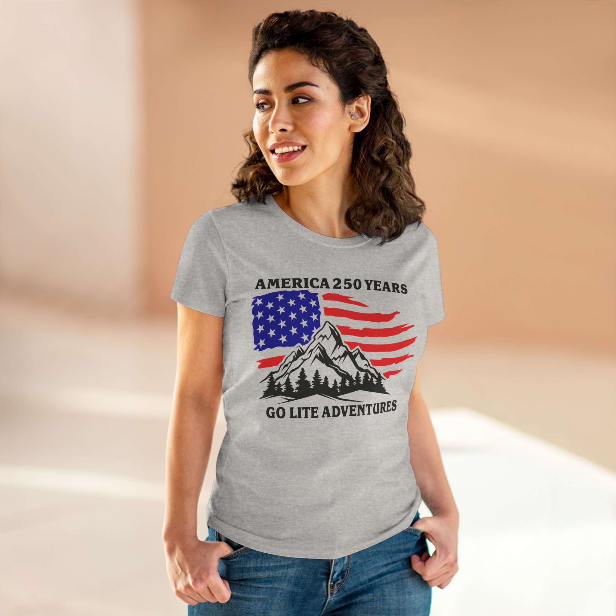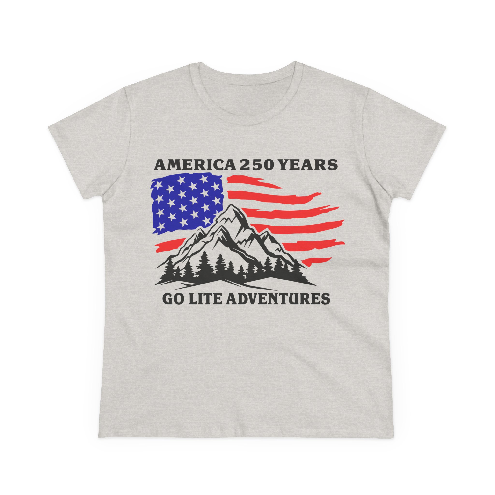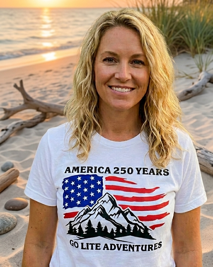 A soft, midweight tee that carries a weekend-ready spirit. The front shows a hand-drawn mountain range set against a red, white and blue American flag, with “America 250 Years” above and “Go Lite Adventures” below — a quiet call to get outside, pack light, and celebrate time on the trail. The semi-fitted cut sits close without clinging, and the medium-weight cotton gives structure while staying breathable for hikes, campfire evenings, or casual downtown strolls. Built with reinforced hems and side seams, it holds its shape through washes and miles. The tear-away label keeps the back neckline smooth under a pack or sweater. Wear it with broken-in jeans, hiking shorts, or layered under a flannel when the air turns crisp.