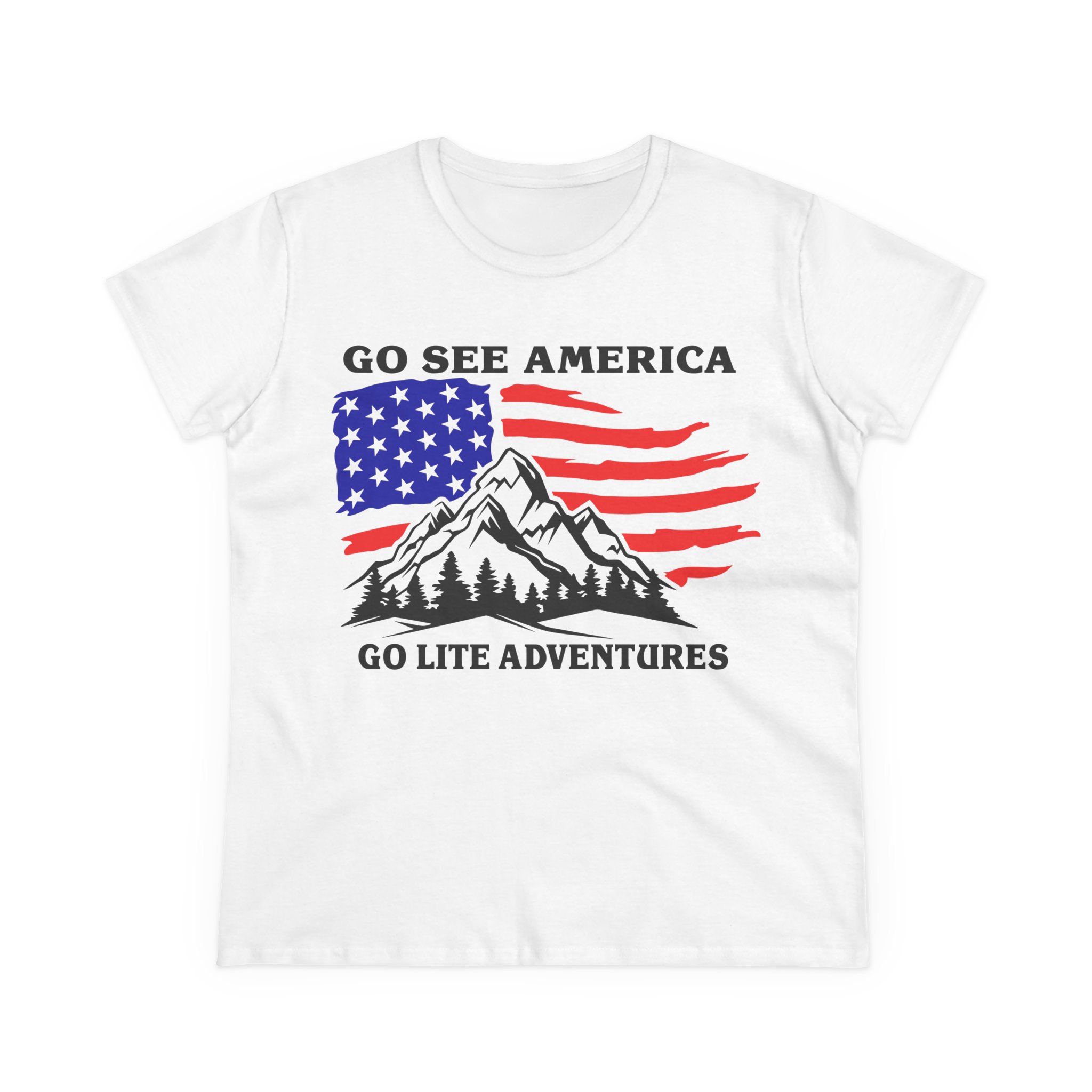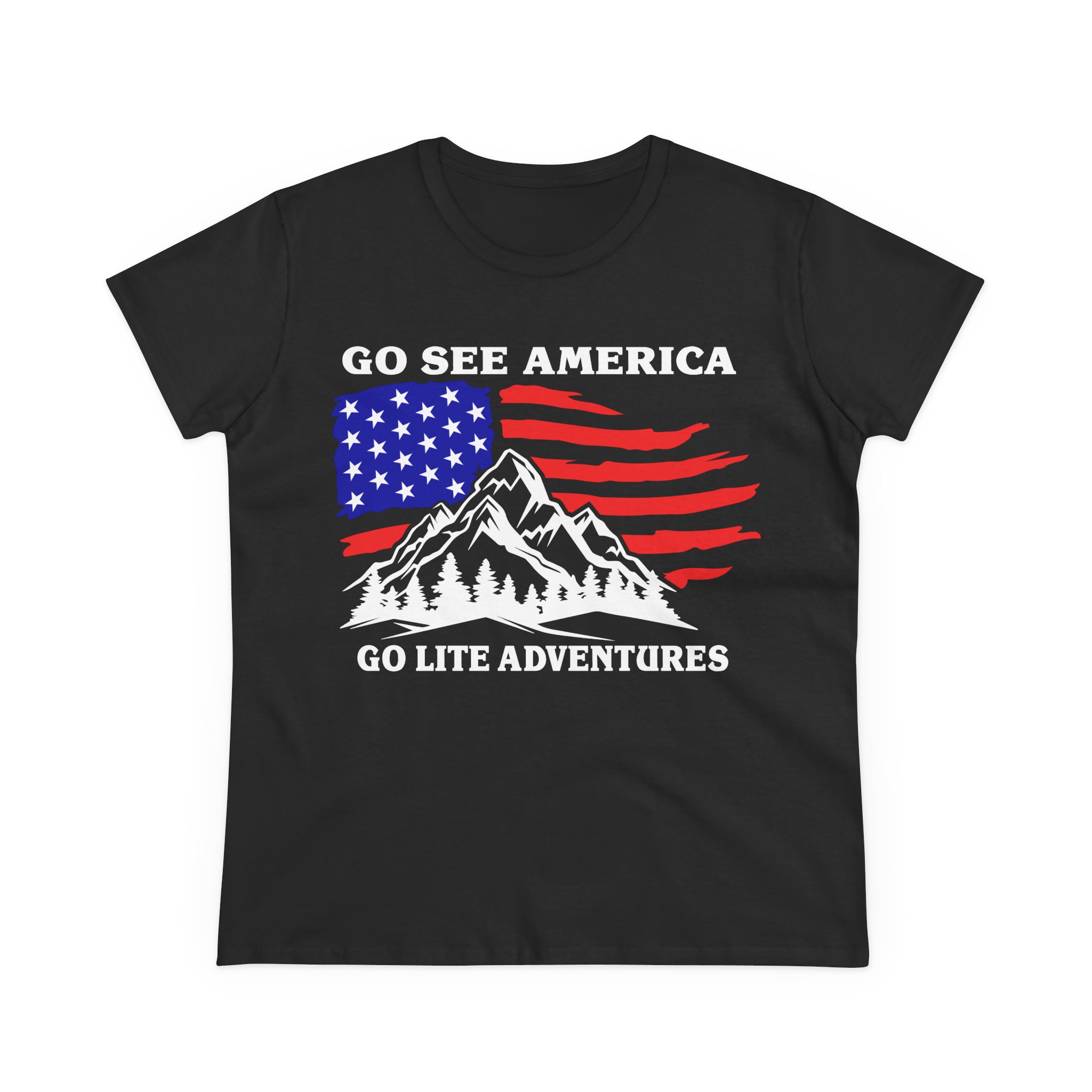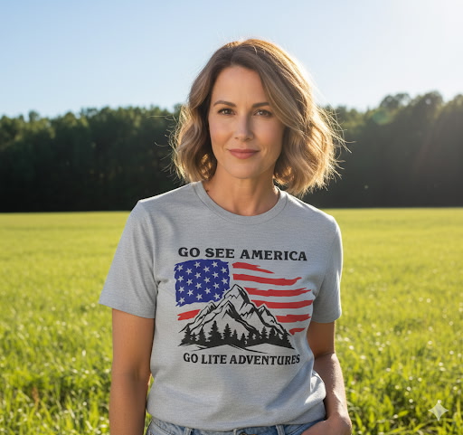 A soft, midweight tee that carries a weekend-ready spirit. The front shows a mountain range set against a red, white and blue American flag, with “Go See America” above and “Go Lite Adventures” below — a quiet call to get outside, pack light, and celebrate time on the trail. The semi-fitted cut sits close without clinging, and the medium-weight cotton gives structure while staying breathable for hikes, campfire evenings, or casual downtown strolls. Built with reinforced hems and side seams, it holds its shape through washes and miles. The tear-away label keeps the back neckline smooth under a pack or sweater. Wear it with broken-in jeans, hiking shorts, or layered under a flannel when the air turns crisp.